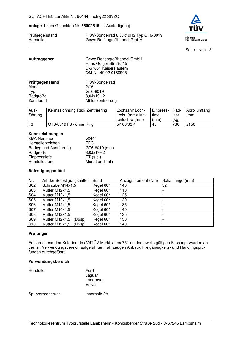 Dieses Gutachten (abe) bezieht sich auf die Alufelge GEWE GT6-8019 in der Ausführung ET 0, Mittenloch 0 mm (KBA 50444). Im PDF findest du typischerweise zulässige Reifengrößen, Auflagen/Anbauhinweise und – je nach Dokument – Hinweise zur Eintragung.