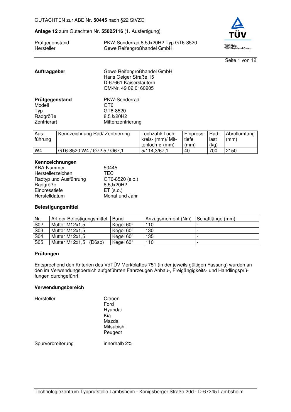 Dieses Gutachten (abe) bezieht sich auf die Alufelge GEWE GT6-8520 in der Ausführung ET 0, Mittenloch 0 mm (KBA 50445). Im PDF findest du typischerweise zulässige Reifengrößen, Auflagen/Anbauhinweise und – je nach Dokument – Hinweise zur Eintragung.