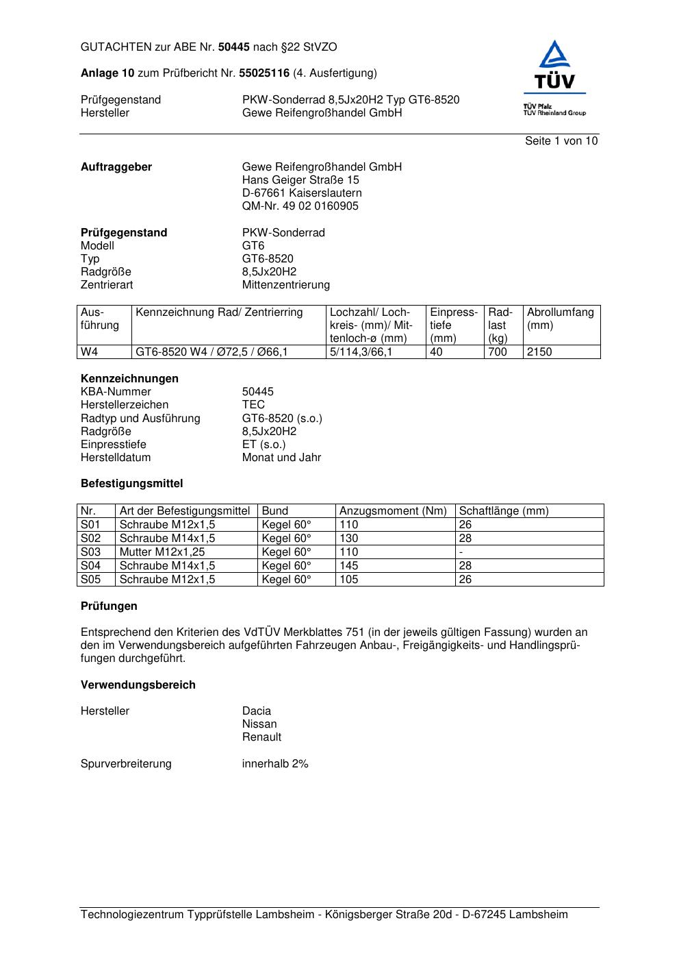 Dieses Gutachten (abe) bezieht sich auf die Alufelge GEWE GT6-8520 in der Ausführung ET 0, Mittenloch 0 mm (KBA 50445). Im PDF findest du typischerweise zulässige Reifengrößen, Auflagen/Anbauhinweise und – je nach Dokument – Hinweise zur Eintragung.