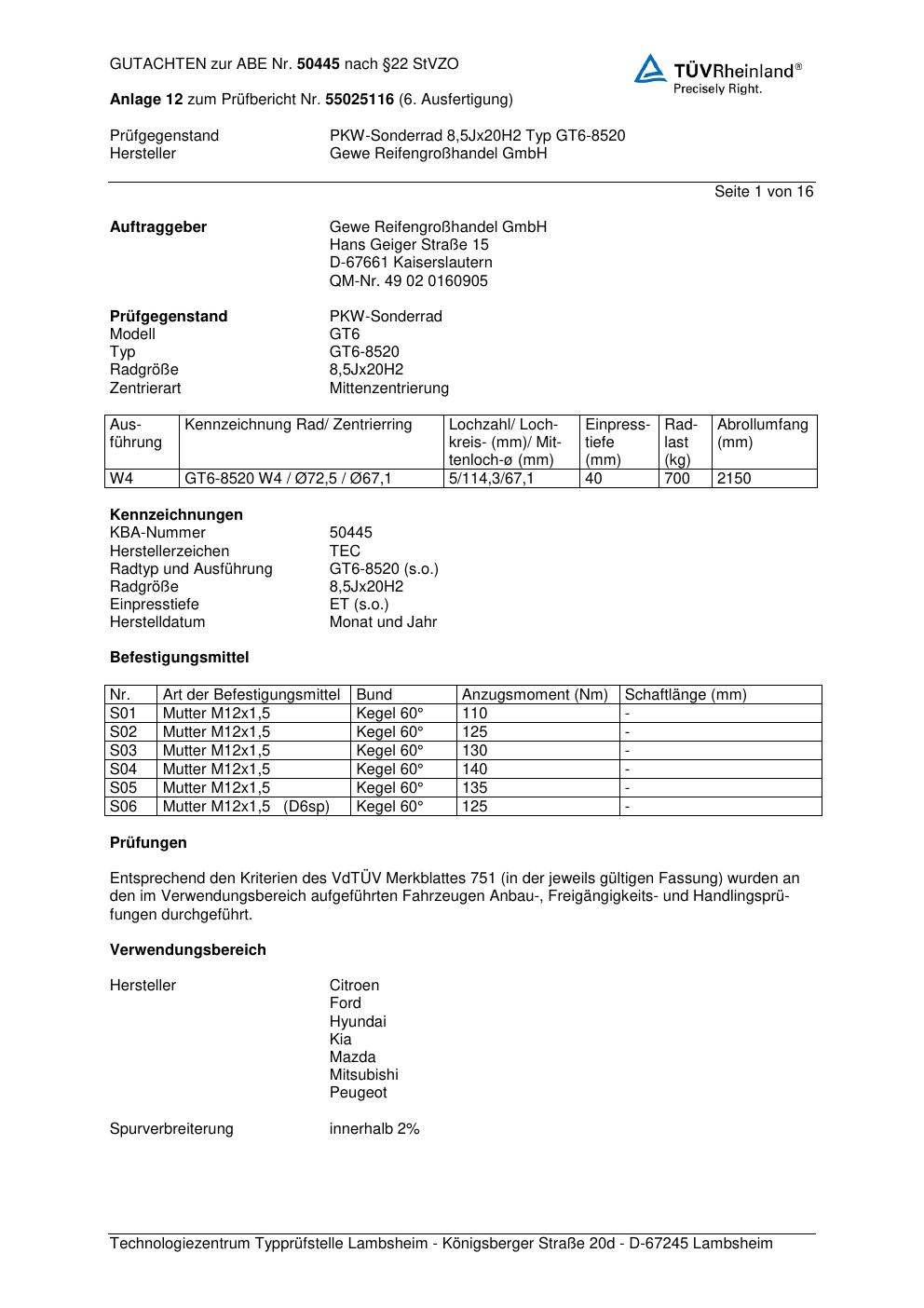 Dieses Gutachten (abe) bezieht sich auf die Alufelge GEWE GT6-8520 in der Ausführung ET 0, Mittenloch 0 mm (KBA 50445). Im PDF findest du typischerweise zulässige Reifengrößen, Auflagen/Anbauhinweise und – je nach Dokument – Hinweise zur Eintragung.