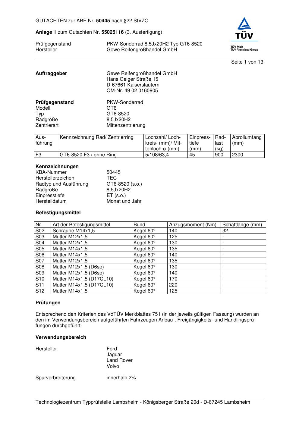 Dieses Gutachten (abe) bezieht sich auf die Alufelge GEWE GT6-8520 in der Ausführung ET 0, Mittenloch 0 mm (KBA 50445). Im PDF findest du typischerweise zulässige Reifengrößen, Auflagen/Anbauhinweise und – je nach Dokument – Hinweise zur Eintragung.