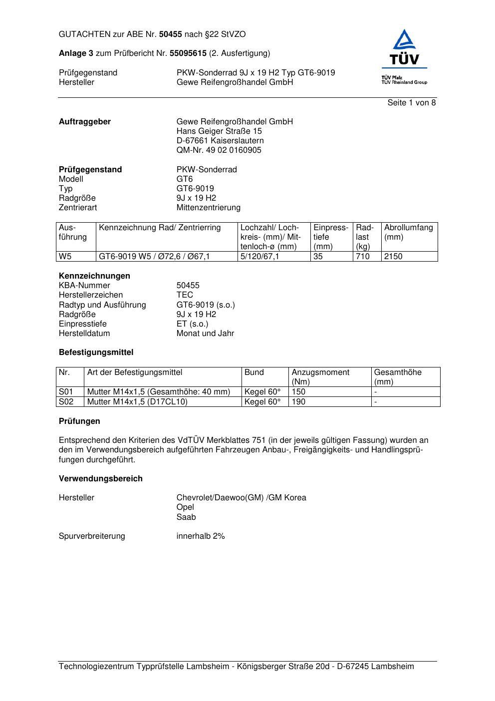 Dieses Gutachten (abe) bezieht sich auf die Alufelge GEWE GT6-9019 in der Ausführung ET 0, Mittenloch 0 mm (KBA 50455). Im PDF findest du typischerweise zulässige Reifengrößen, Auflagen/Anbauhinweise und – je nach Dokument – Hinweise zur Eintragung.