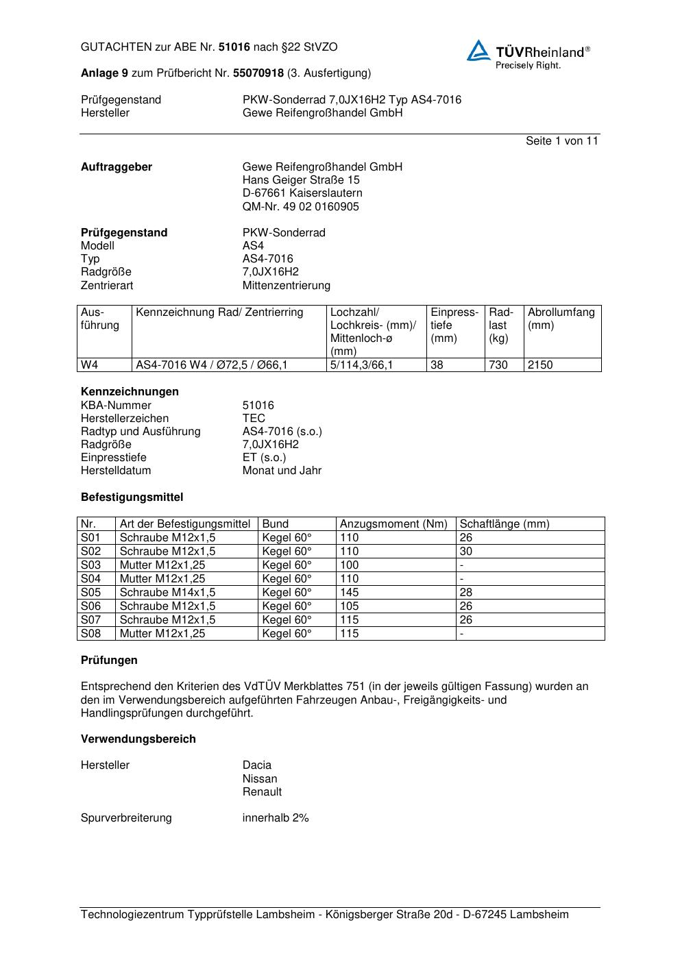Dieses Gutachten (abe) bezieht sich auf die Alufelge GEWE AS4-7016 in der Ausführung ET 0, Mittenloch 0 mm (KBA 51016). Im PDF findest du typischerweise zulässige Reifengrößen, Auflagen/Anbauhinweise und – je nach Dokument – Hinweise zur Eintragung.