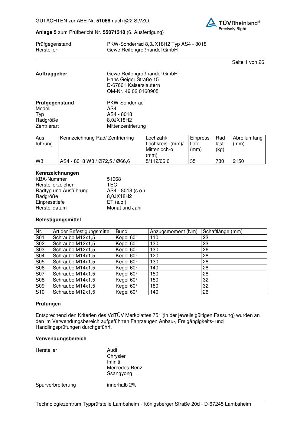 - Gewe Reifengroßhandel GmbH AS4 - 80 18 – 0.0Jx0 ET0.0 (KBA 51068)