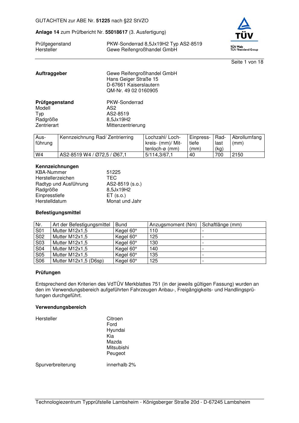 Dieses Gutachten (abe) bezieht sich auf die Alufelge GEWE AS2-8519 in der Ausführung ET 0, Mittenloch 0 mm (KBA 51225). Im PDF findest du typischerweise zulässige Reifengrößen, Auflagen/Anbauhinweise und – je nach Dokument – Hinweise zur Eintragung.