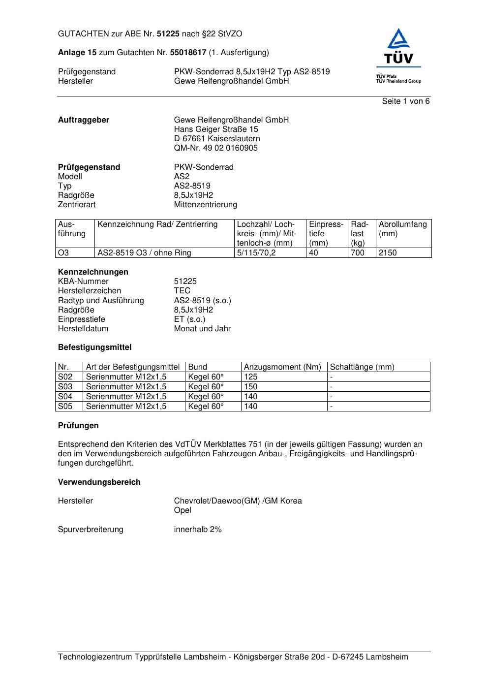 Dieses Gutachten (abe) bezieht sich auf die Alufelge GEWE AS2-8519 in der Ausführung ET 0, Mittenloch 0 mm (KBA 51225). Im PDF findest du typischerweise zulässige Reifengrößen, Auflagen/Anbauhinweise und – je nach Dokument – Hinweise zur Eintragung.