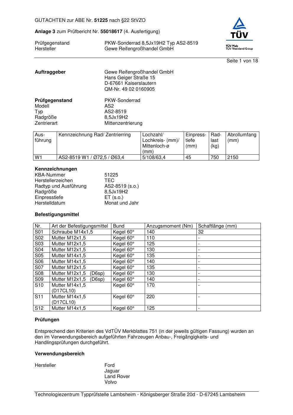 Dieses Gutachten (abe) bezieht sich auf die Alufelge GEWE AS2-8519 in der Ausführung ET 0, Mittenloch 0 mm (KBA 51225). Im PDF findest du typischerweise zulässige Reifengrößen, Auflagen/Anbauhinweise und – je nach Dokument – Hinweise zur Eintragung.