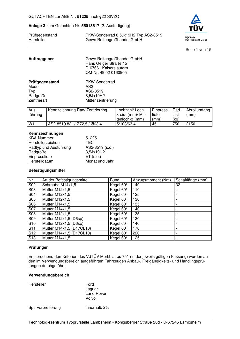 Dieses Gutachten (abe) bezieht sich auf die Alufelge GEWE AS2-8519 in der Ausführung ET 0, Mittenloch 0 mm (KBA 51225). Im PDF findest du typischerweise zulässige Reifengrößen, Auflagen/Anbauhinweise und – je nach Dokument – Hinweise zur Eintragung.