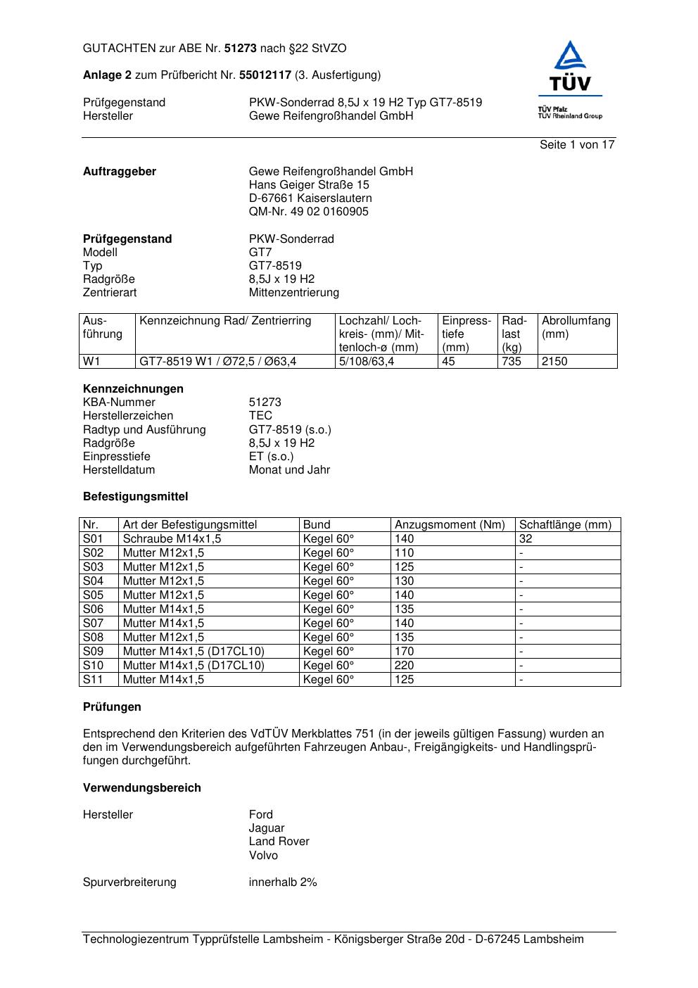 Dieses Gutachten (abe) bezieht sich auf die Alufelge GEWE GT7-8519 in der Ausführung ET 0, Mittenloch 0 mm (KBA 51273). Im PDF findest du typischerweise zulässige Reifengrößen, Auflagen/Anbauhinweise und – je nach Dokument – Hinweise zur Eintragung.