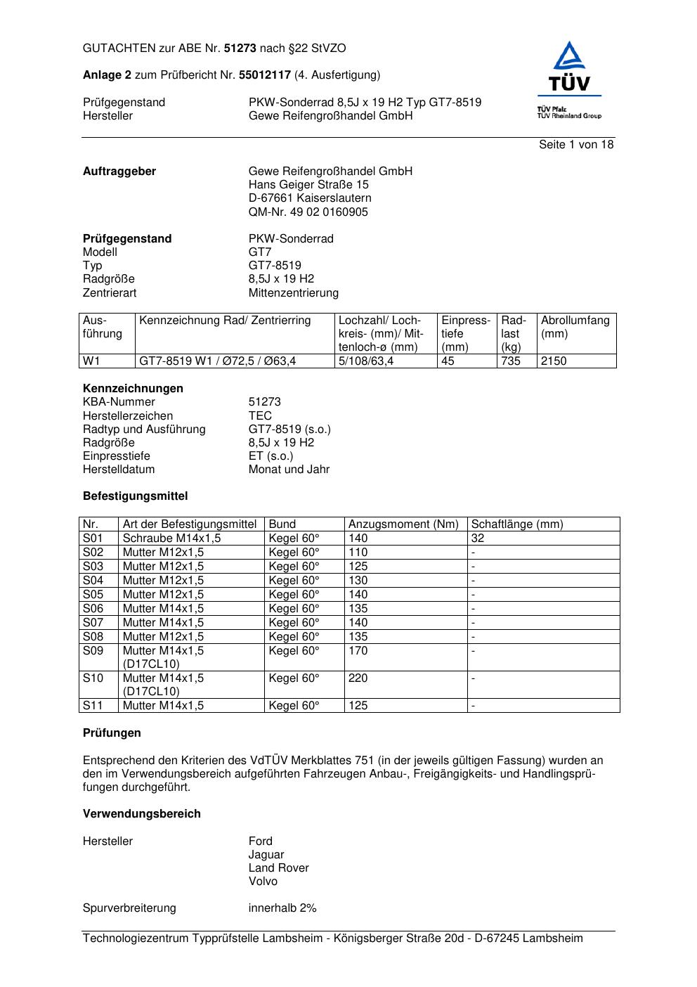 Dieses Gutachten (abe) bezieht sich auf die Alufelge GEWE GT7-8519 in der Ausführung ET 0, Mittenloch 0 mm (KBA 51273). Im PDF findest du typischerweise zulässige Reifengrößen, Auflagen/Anbauhinweise und – je nach Dokument – Hinweise zur Eintragung.