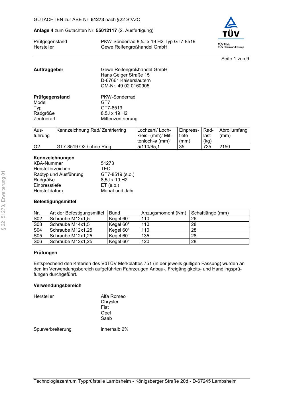 Dieses Gutachten (abe) bezieht sich auf die Alufelge GEWE GT7 -8519 in der Ausführung ET 0, Mittenloch 0 mm (KBA 51273). Im PDF findest du typischerweise zulässige Reifengrößen, Auflagen/Anbauhinweise und – je nach Dokument – Hinweise zur Eintragung.