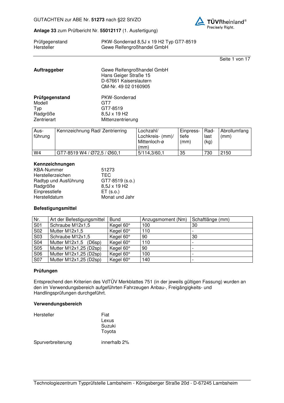 Dieses Gutachten (abe) bezieht sich auf die Alufelge GEWE GT7-8 519 in der Ausführung ET 0, Mittenloch 0 mm (KBA 51273). Im PDF findest du typischerweise zulässige Reifengrößen, Auflagen/Anbauhinweise und – je nach Dokument – Hinweise zur Eintragung.