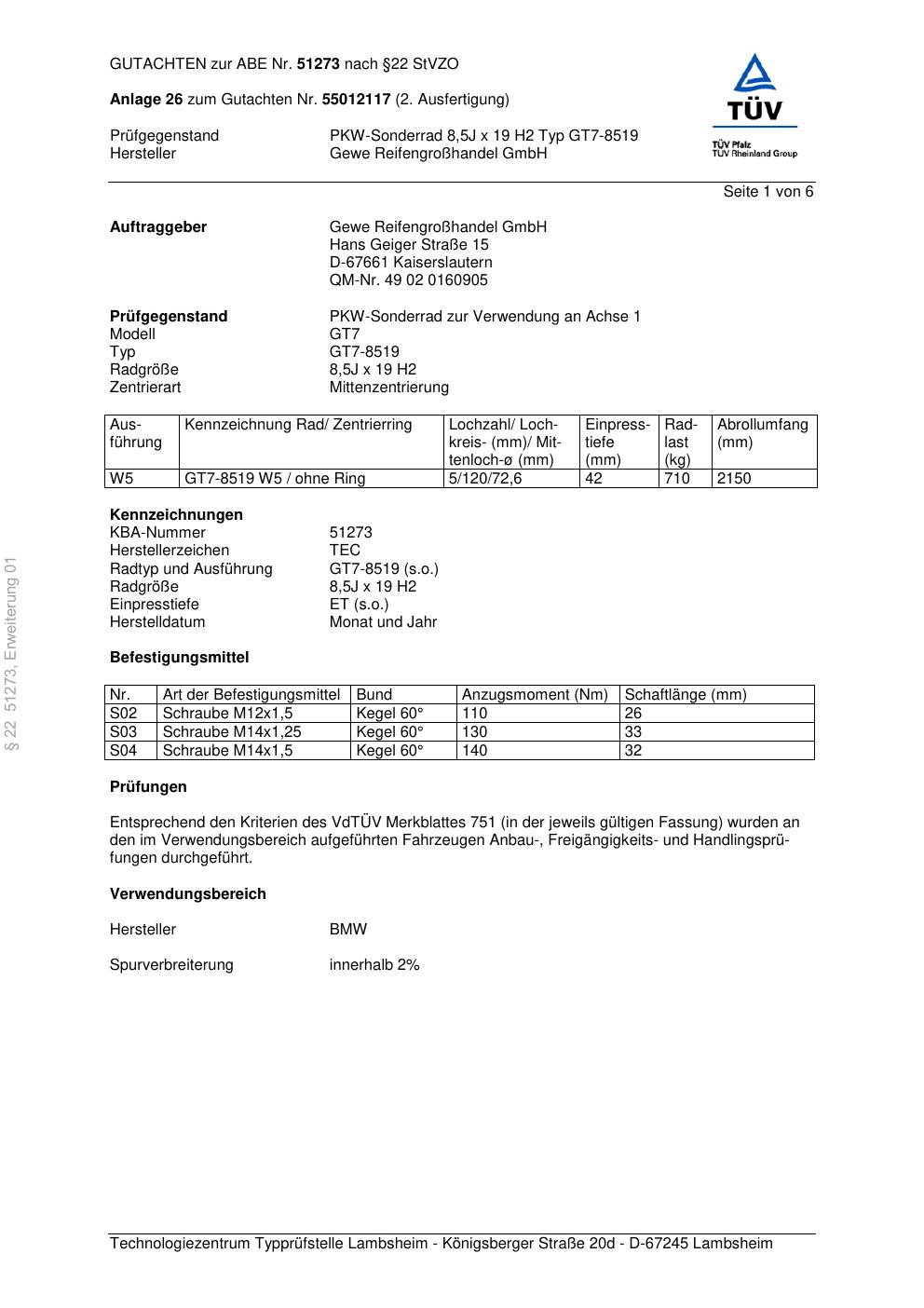 Dieses Gutachten (abe) bezieht sich auf die Alufelge Gewe Reifengroßhandel GmbH (Herstellerzeichen: TEC) GT7-8519 in der Ausführung ET 0, Mittenloch 0 mm (KBA 51273). Im PDF findest du typischerweise zulässige Reifengrößen, Auflagen/Anbauhinweise und – je nach Dokument – Hinweise zur Eintragung.