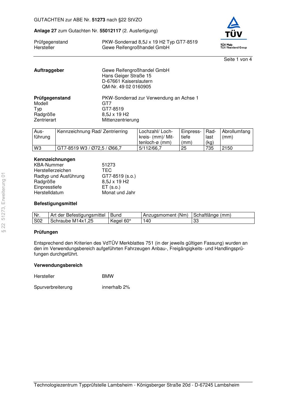 Dieses Gutachten (abe) bezieht sich auf die Alufelge GEWE GT7-8519 in der Ausführung ET 0, Mittenloch 0 mm (KBA 51273). Im PDF findest du typischerweise zulässige Reifengrößen, Auflagen/Anbauhinweise und – je nach Dokument – Hinweise zur Eintragung.