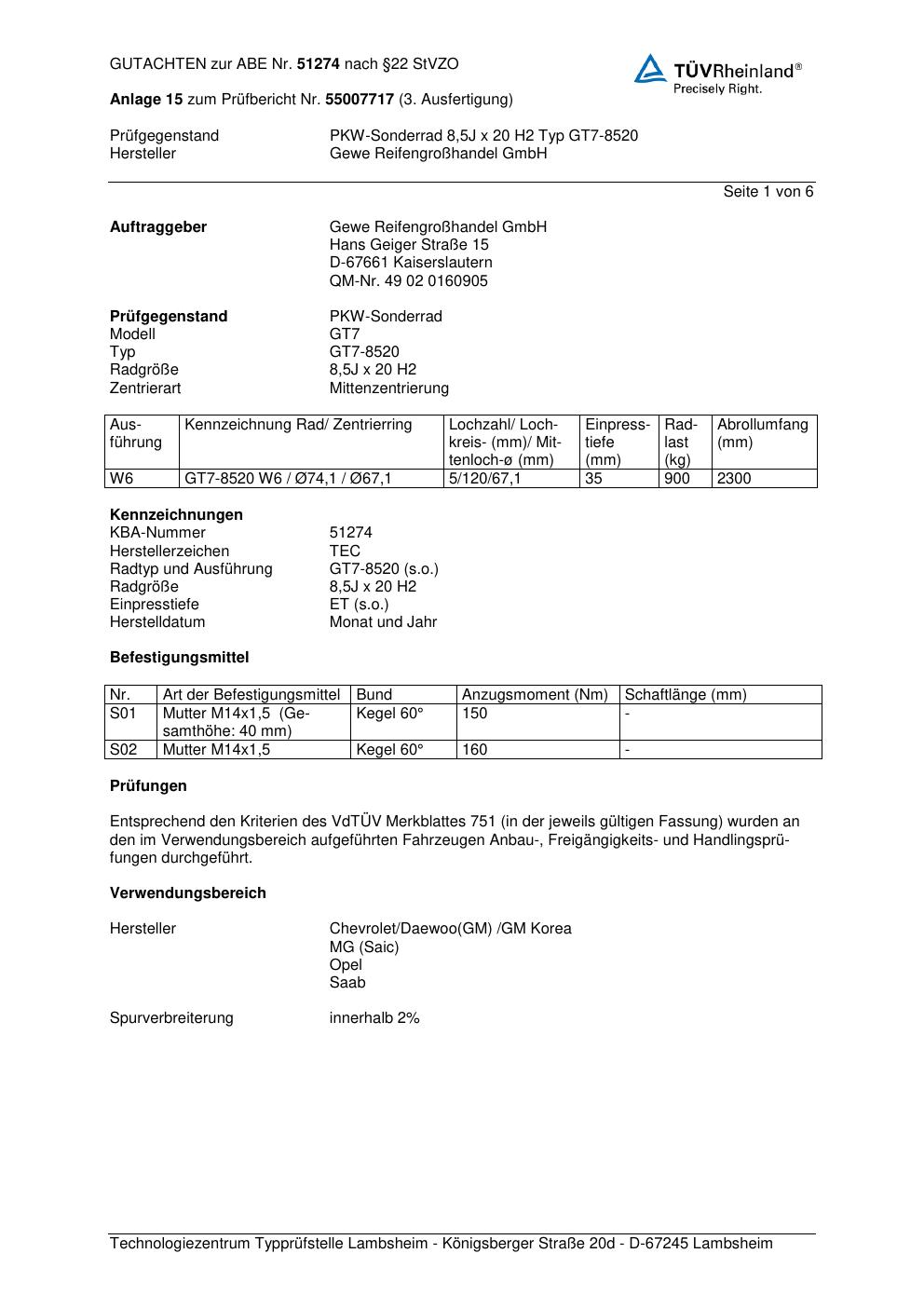 Dieses Gutachten (abe) bezieht sich auf die Alufelge GEWE GT7-8520 in der Ausführung ET 0, Mittenloch 0 mm (KBA 51274). Im PDF findest du typischerweise zulässige Reifengrößen, Auflagen/Anbauhinweise und – je nach Dokument – Hinweise zur Eintragung.