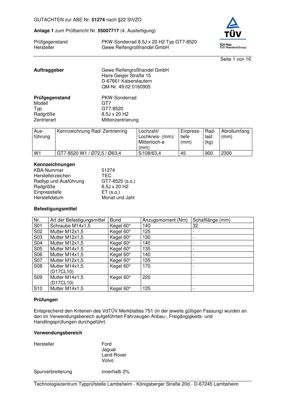 Dieses Gutachten (abe) bezieht sich auf die Alufelge GEWE GT7-8520 in der Ausführung ET 0, Mittenloch 0 mm (KBA 51274). Im PDF findest du typischerweise zulässige Reifengrößen, Auflagen/Anbauhinweise und – je nach Dokument – Hinweise zur Eintragung.