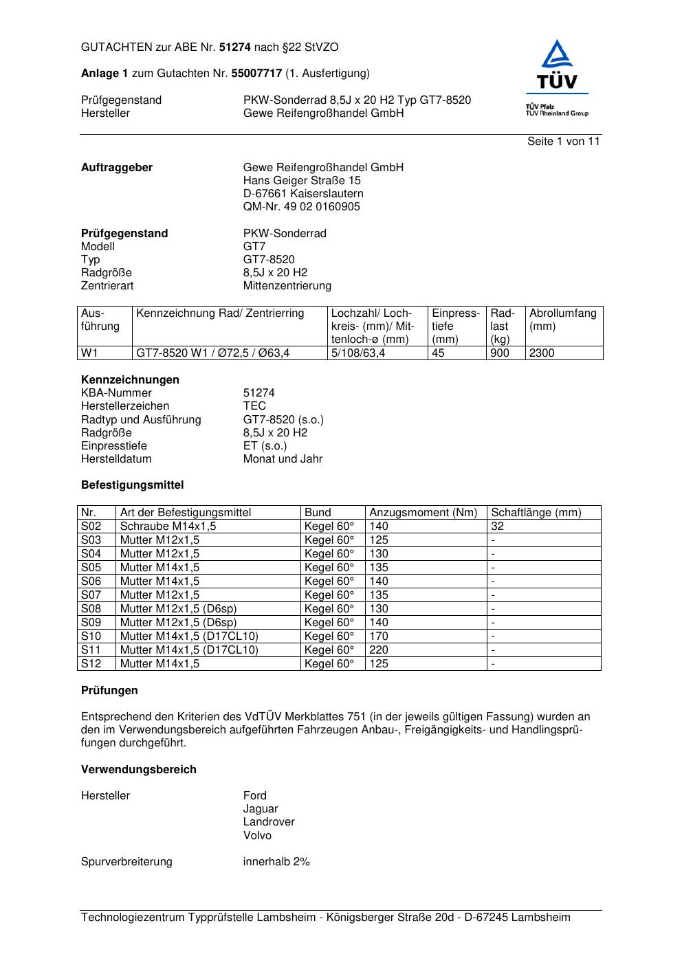 Dieses Gutachten (abe) bezieht sich auf die Alufelge GEWE GT7-8 520 in der Ausführung ET 0, Mittenloch 0 mm (KBA 51274). Im PDF findest du typischerweise zulässige Reifengrößen, Auflagen/Anbauhinweise und – je nach Dokument – Hinweise zur Eintragung.