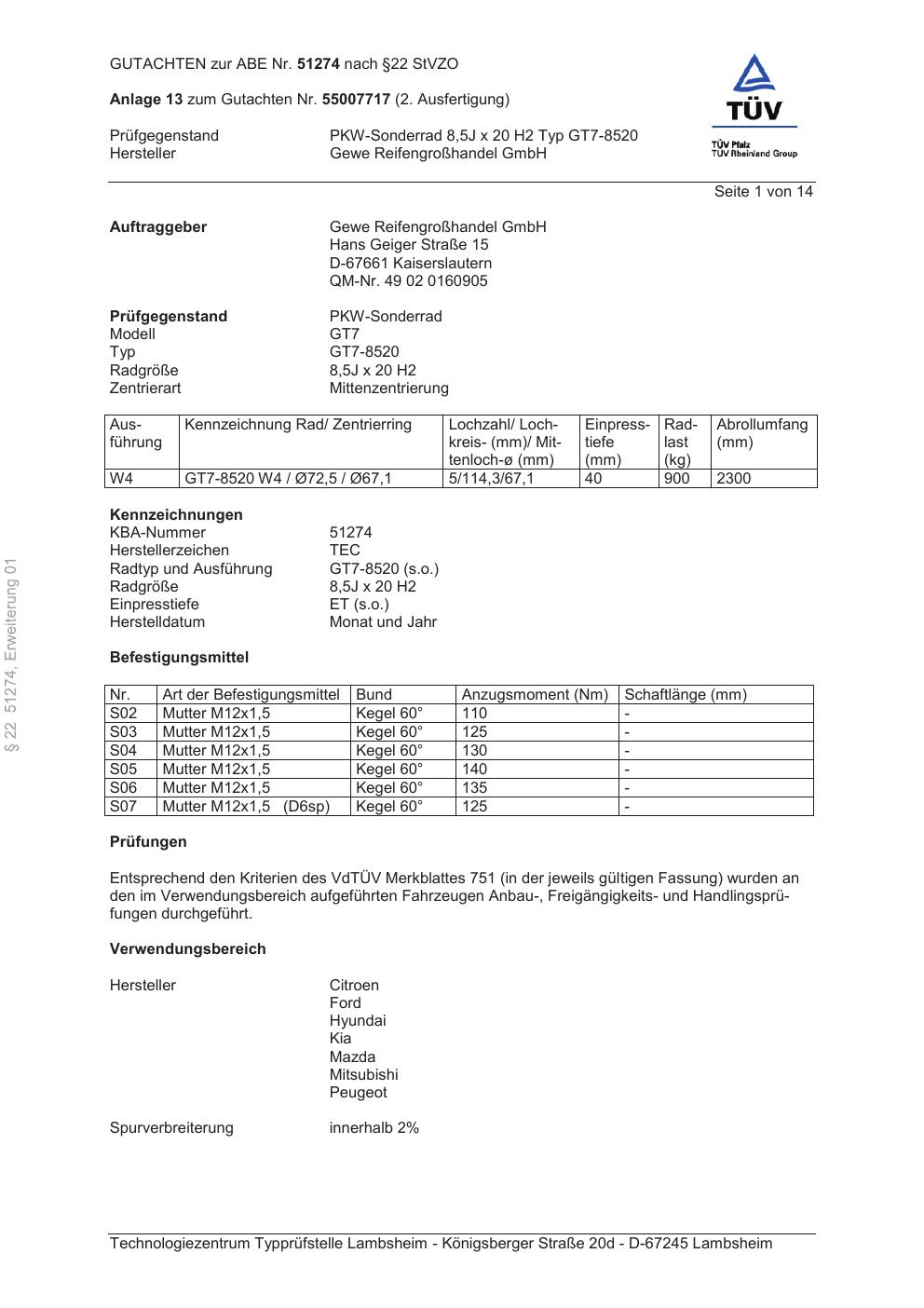Dieses Gutachten (abe) bezieht sich auf die Alufelge GEWE GT7-8520 in der Ausführung ET 0, Mittenloch 0 mm (KBA 51274). Im PDF findest du typischerweise zulässige Reifengrößen, Auflagen/Anbauhinweise und – je nach Dokument – Hinweise zur Eintragung.