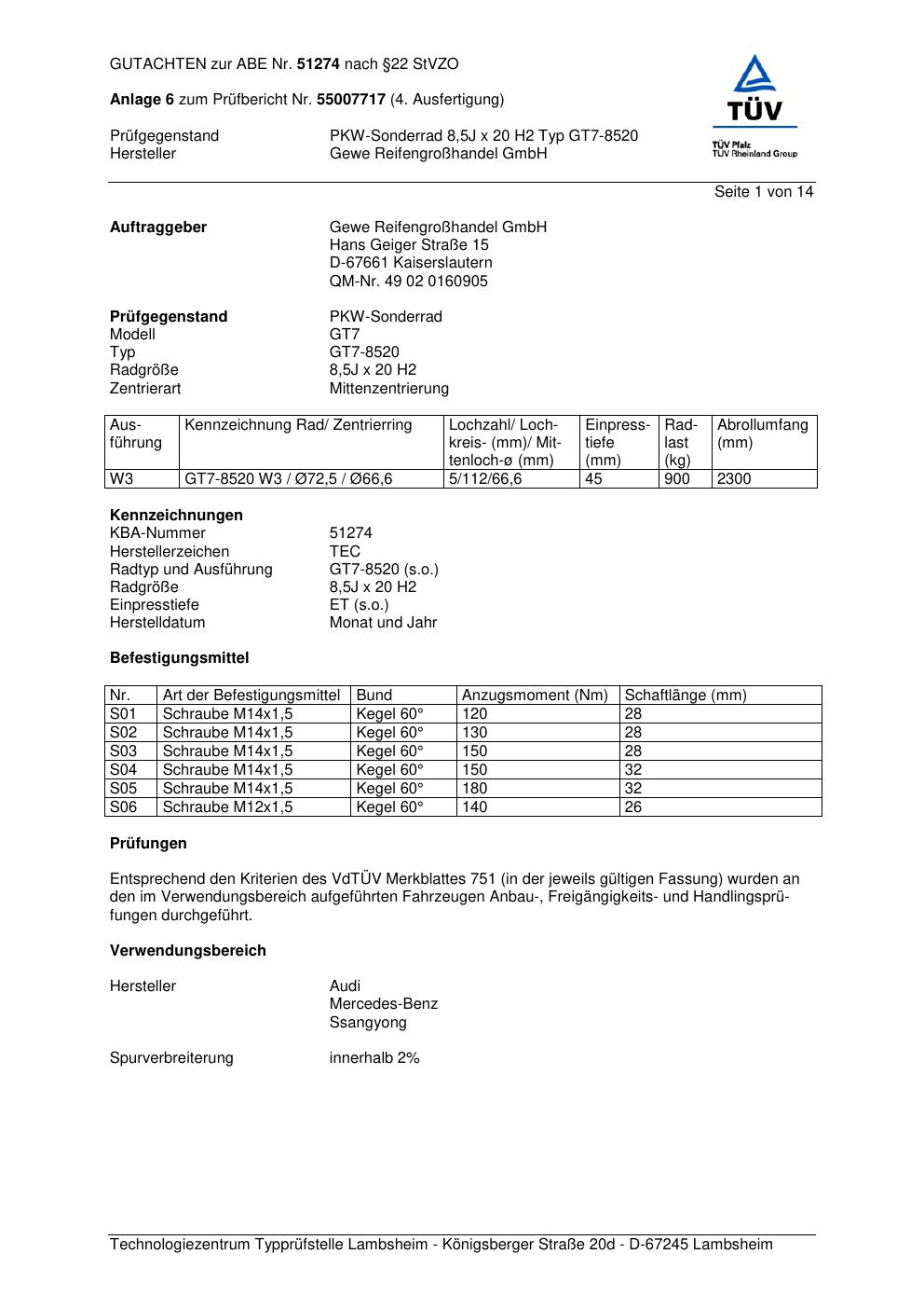 Dieses Gutachten (abe) bezieht sich auf die Alufelge GEWE GT7-8520 in der Ausführung ET 0, Mittenloch 0 mm (KBA 51274). Im PDF findest du typischerweise zulässige Reifengrößen, Auflagen/Anbauhinweise und – je nach Dokument – Hinweise zur Eintragung.