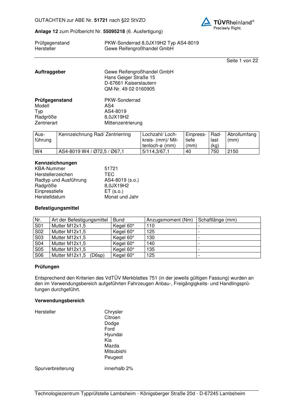 Dieses Gutachten (abe) bezieht sich auf die Alufelge GEWE AS4-8019 in der Ausführung ET 0, Mittenloch 0 mm (KBA 51721). Im PDF findest du typischerweise zulässige Reifengrößen, Auflagen/Anbauhinweise und – je nach Dokument – Hinweise zur Eintragung.