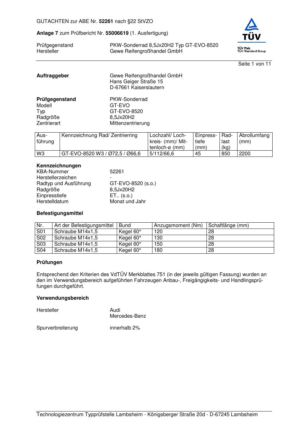 Dieses Gutachten (abe) bezieht sich auf die Alufelge GEWE GT-EVO-8 520 in der Ausführung ET 0, Mittenloch 0 mm (KBA 52261). Im PDF findest du typischerweise zulässige Reifengrößen, Auflagen/Anbauhinweise und – je nach Dokument – Hinweise zur Eintragung.