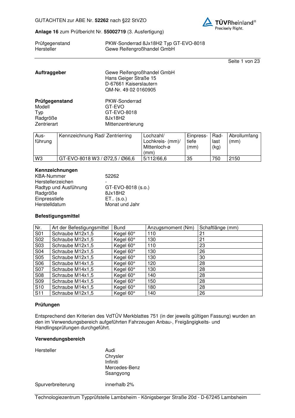 Dieses Gutachten (abe) bezieht sich auf die Alufelge GEWE GT-EVO-8018 in der Ausführung ET 0, Mittenloch 0 mm (KBA 52262). Im PDF findest du typischerweise zulässige Reifengrößen, Auflagen/Anbauhinweise und – je nach Dokument – Hinweise zur Eintragung.