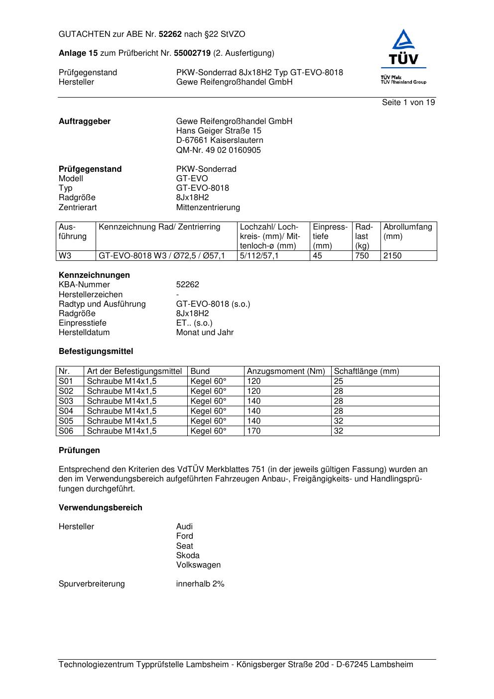 Felgengutachten / abe für Alufelgen Gewe Reifengrorogerreifengrohandel GmbH GT-EVO-801 8 (ET 0, Mittenloch 0 mm) mit KBA 52262 (Zertifikatsnummer 52262). Hier kostenlos als PDF herunterladen. Der Download-Link ist 24 Stunden gültig und kann bis zu zwei Mal verwendet werden.