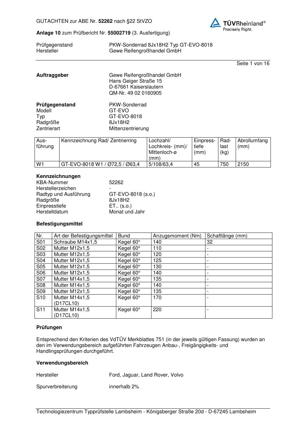 Dieses Gutachten (abe) bezieht sich auf die Alufelge Gewe Reifengro fhandel GmbH GT-EVO-8018 in der Ausführung ET 0, Mittenloch 0 mm (KBA 52262). Im PDF findest du typischerweise zulässige Reifengrößen, Auflagen/Anbauhinweise und – je nach Dokument – Hinweise zur Eintragung.