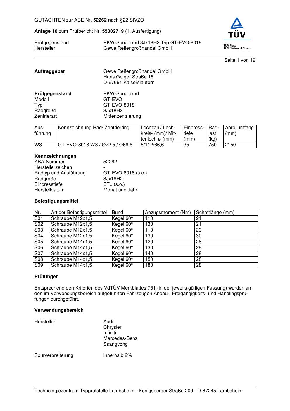 Dieses Gutachten (abe) bezieht sich auf die Alufelge GEWE GT-EVO-8018 in der Ausführung ET 0, Mittenloch 0 mm (KBA 52262). Im PDF findest du typischerweise zulässige Reifengrößen, Auflagen/Anbauhinweise und – je nach Dokument – Hinweise zur Eintragung.