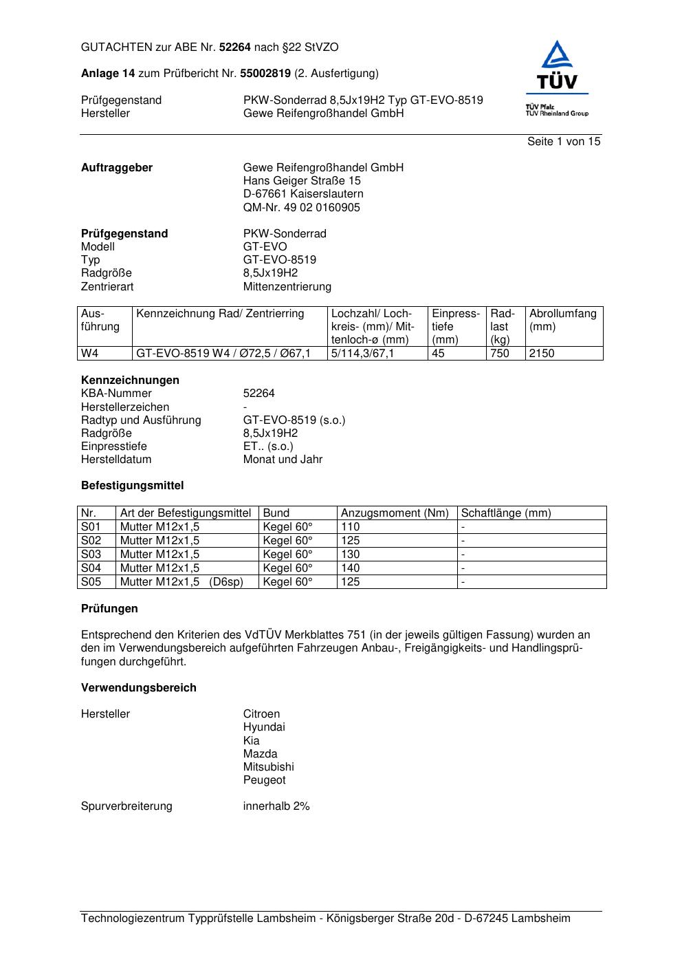 Dieses Gutachten (abe) bezieht sich auf die Alufelge GEWE GT-EVO-8 519 in der Ausführung ET 0, Mittenloch 0 mm (KBA 52264). Im PDF findest du typischerweise zulässige Reifengrößen, Auflagen/Anbauhinweise und – je nach Dokument – Hinweise zur Eintragung.