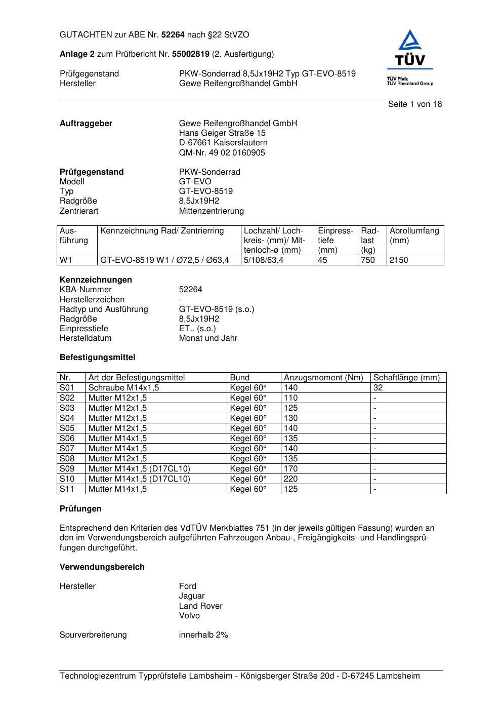 Felgengutachten / abe für Alufelgen GEWE GT-EVO-8519 (ET 0, Mittenloch 0 mm) mit KBA 52264 (Zertifikatsnummer 52264). Hier kostenlos als PDF herunterladen. Der Download-Link ist 24 Stunden gültig und kann bis zu zwei Mal verwendet werden.