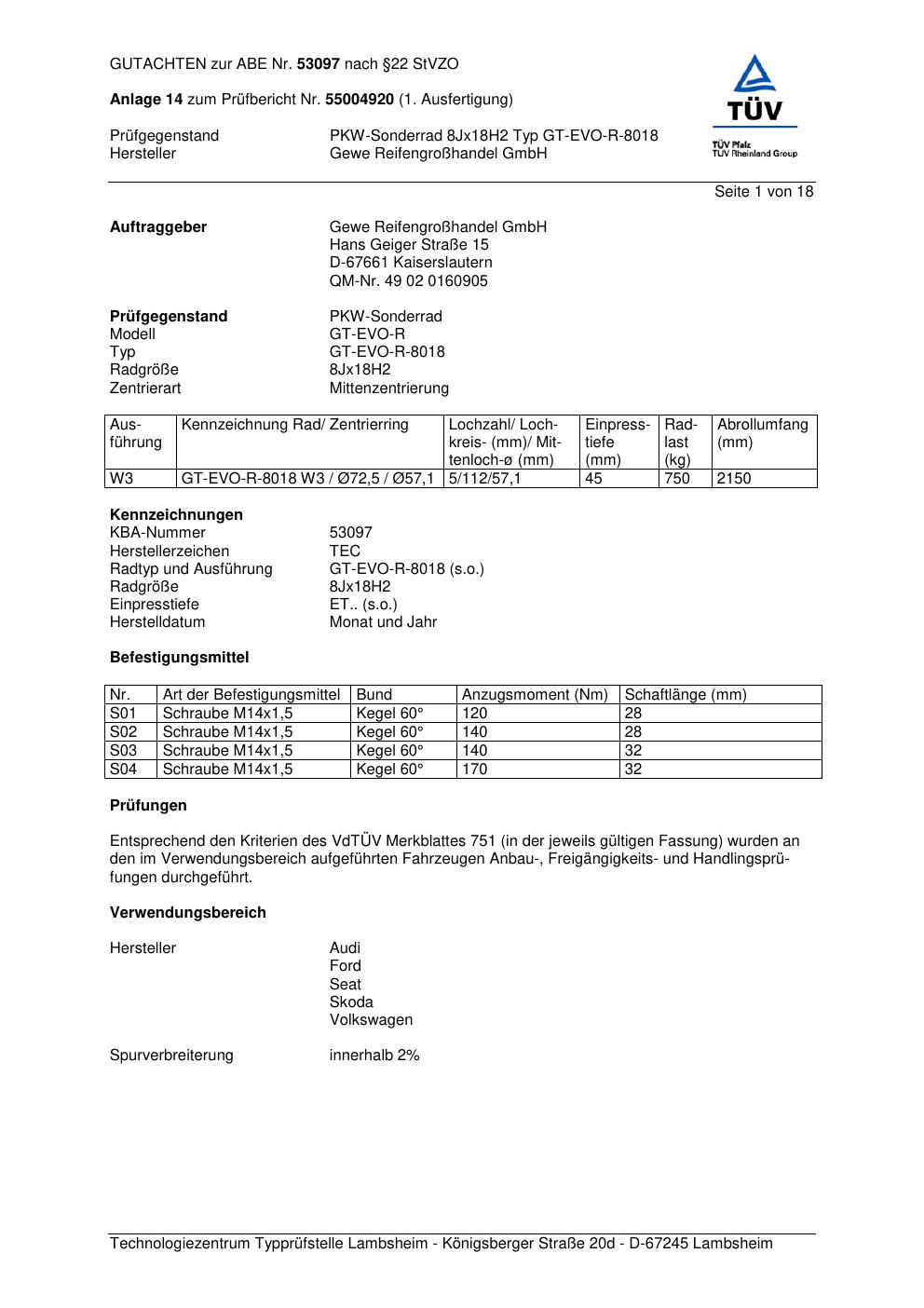 Dieses Gutachten (abe) bezieht sich auf die Alufelge GEWE GT-EVO-R-8018 in der Ausführung ET 0, Mittenloch 0 mm (KBA 53097). Im PDF findest du typischerweise zulässige Reifengrößen, Auflagen/Anbauhinweise und – je nach Dokument – Hinweise zur Eintragung.