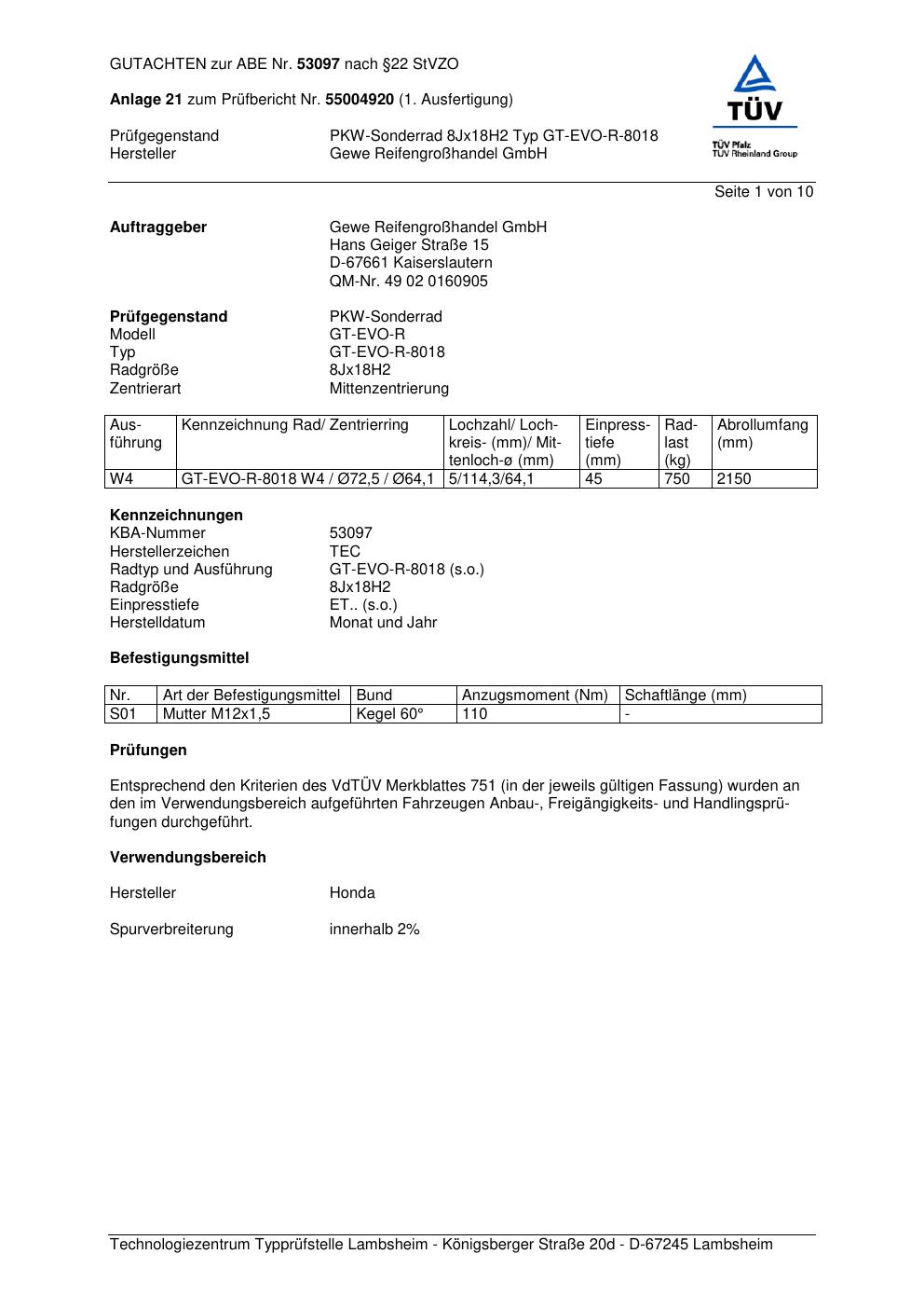 Dieses Gutachten (abe) bezieht sich auf die Alufelge GEWE GT-EVO-R-8 018 in der Ausführung ET 0, Mittenloch 0 mm (KBA 53097). Im PDF findest du typischerweise zulässige Reifengrößen, Auflagen/Anbauhinweise und – je nach Dokument – Hinweise zur Eintragung.