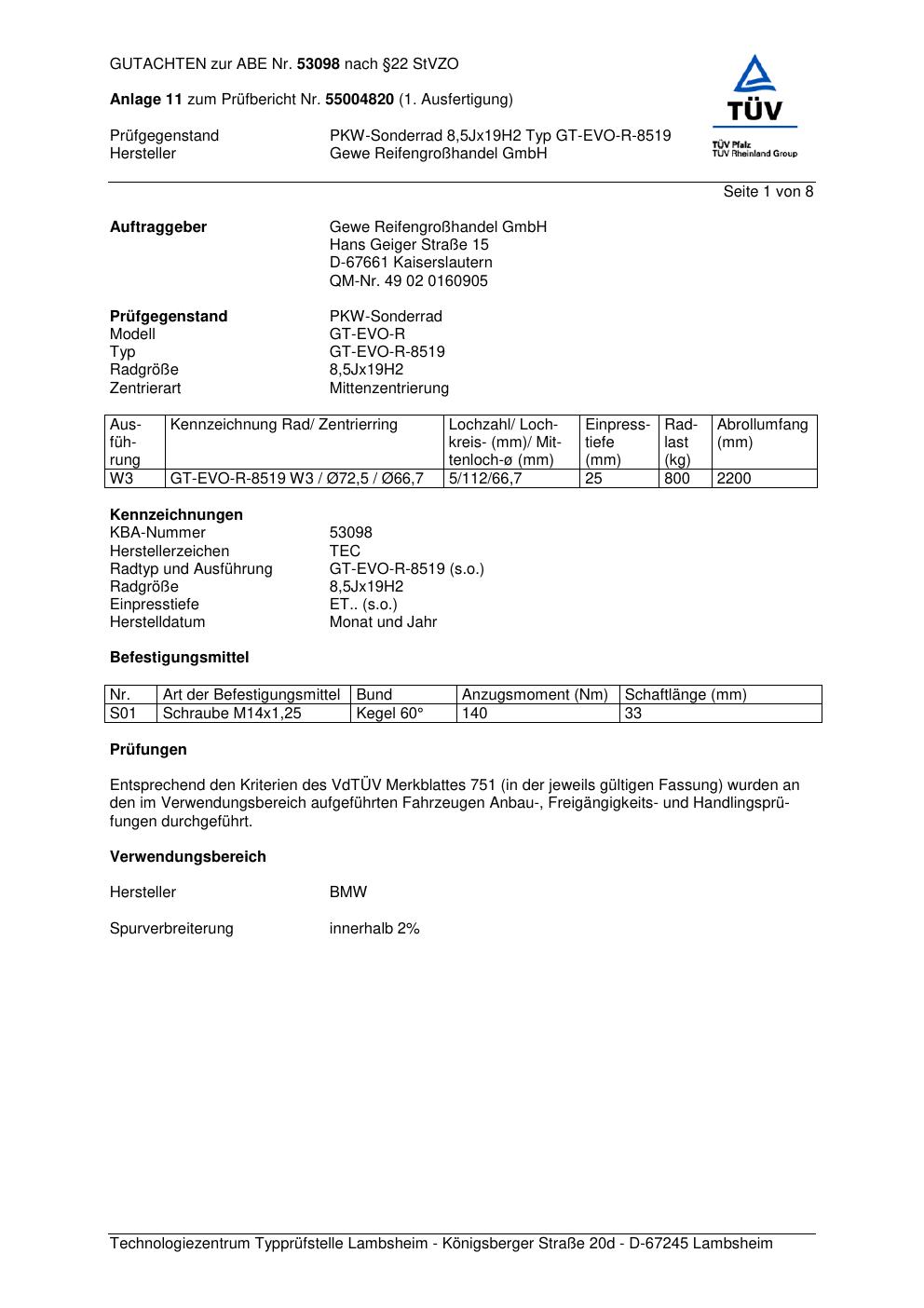 Dieses Gutachten (abe) bezieht sich auf die Alufelge GEWE GT-EVO-R-8519 in der Ausführung ET 0, Mittenloch 0 mm (KBA 53098). Im PDF findest du typischerweise zulässige Reifengrößen, Auflagen/Anbauhinweise und – je nach Dokument – Hinweise zur Eintragung.