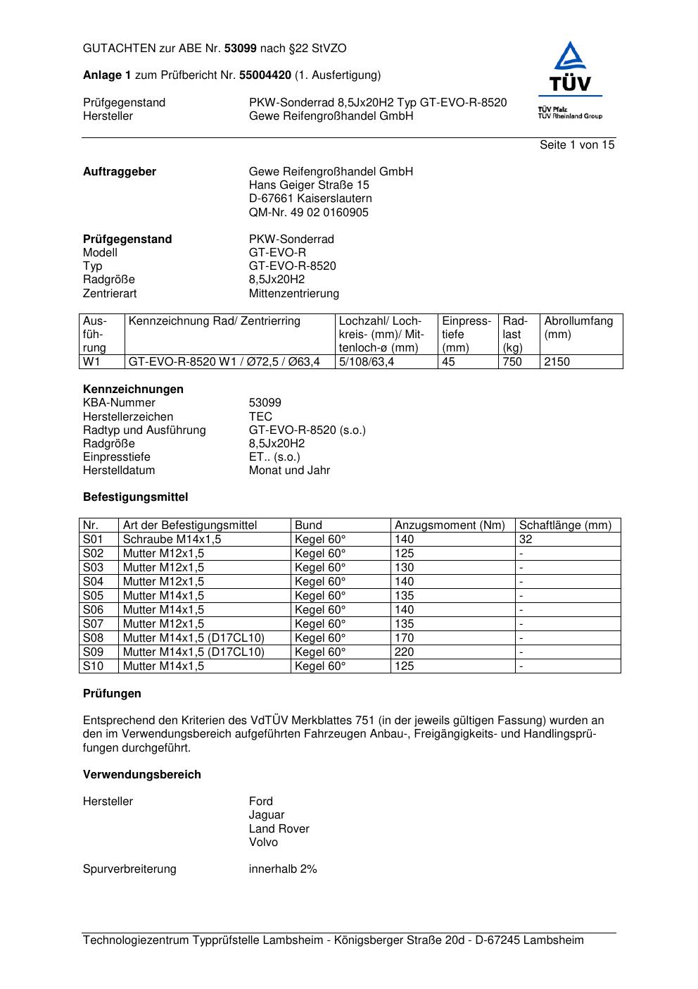 Dieses Gutachten (abe) bezieht sich auf die Alufelge GEWE GT-EVO-R-8520 in der Ausführung ET 0, Mittenloch 0 mm (KBA 53099). Im PDF findest du typischerweise zulässige Reifengrößen, Auflagen/Anbauhinweise und – je nach Dokument – Hinweise zur Eintragung.