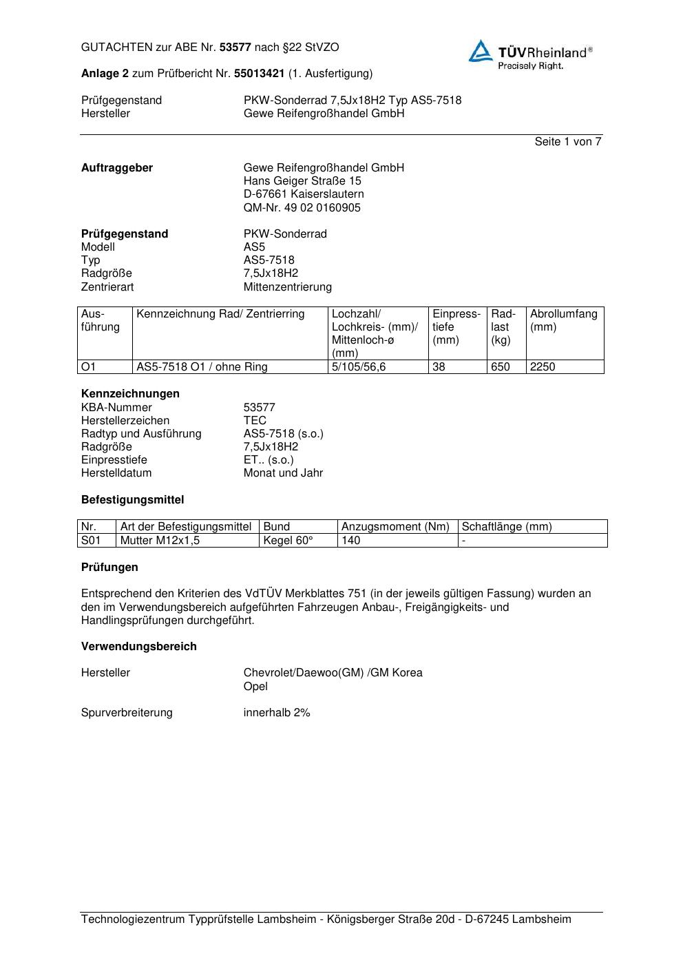 Dieses Gutachten (abe) bezieht sich auf die Alufelge GEWE AS5-7518 in der Ausführung ET 0, Mittenloch 0 mm (KBA 53577). Im PDF findest du typischerweise zulässige Reifengrößen, Auflagen/Anbauhinweise und – je nach Dokument – Hinweise zur Eintragung.