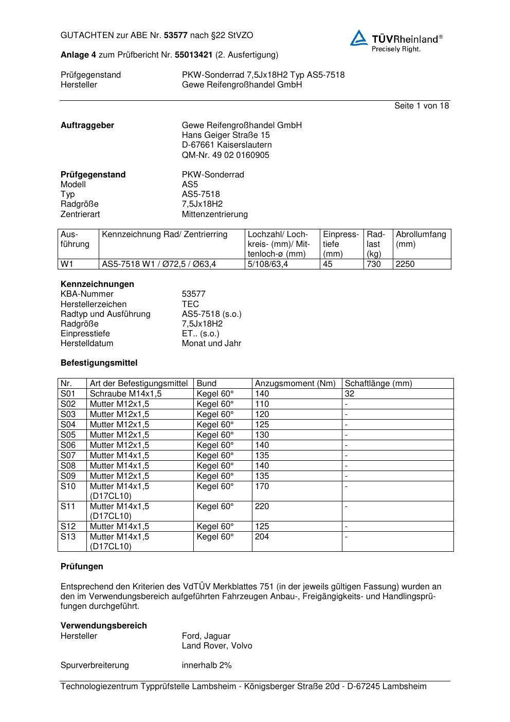 Dieses Gutachten (abe) bezieht sich auf die Alufelge GEWE AS5-7518 in der Ausführung ET 0, Mittenloch 0 mm (KBA 53577). Im PDF findest du typischerweise zulässige Reifengrößen, Auflagen/Anbauhinweise und – je nach Dokument – Hinweise zur Eintragung.