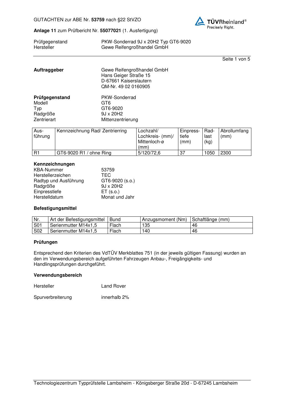 Dieses Gutachten (abe) bezieht sich auf die Alufelge GEWE GT6-9020 in der Ausführung ET 0, Mittenloch 0 mm (KBA 53759). Im PDF findest du typischerweise zulässige Reifengrößen, Auflagen/Anbauhinweise und – je nach Dokument – Hinweise zur Eintragung.