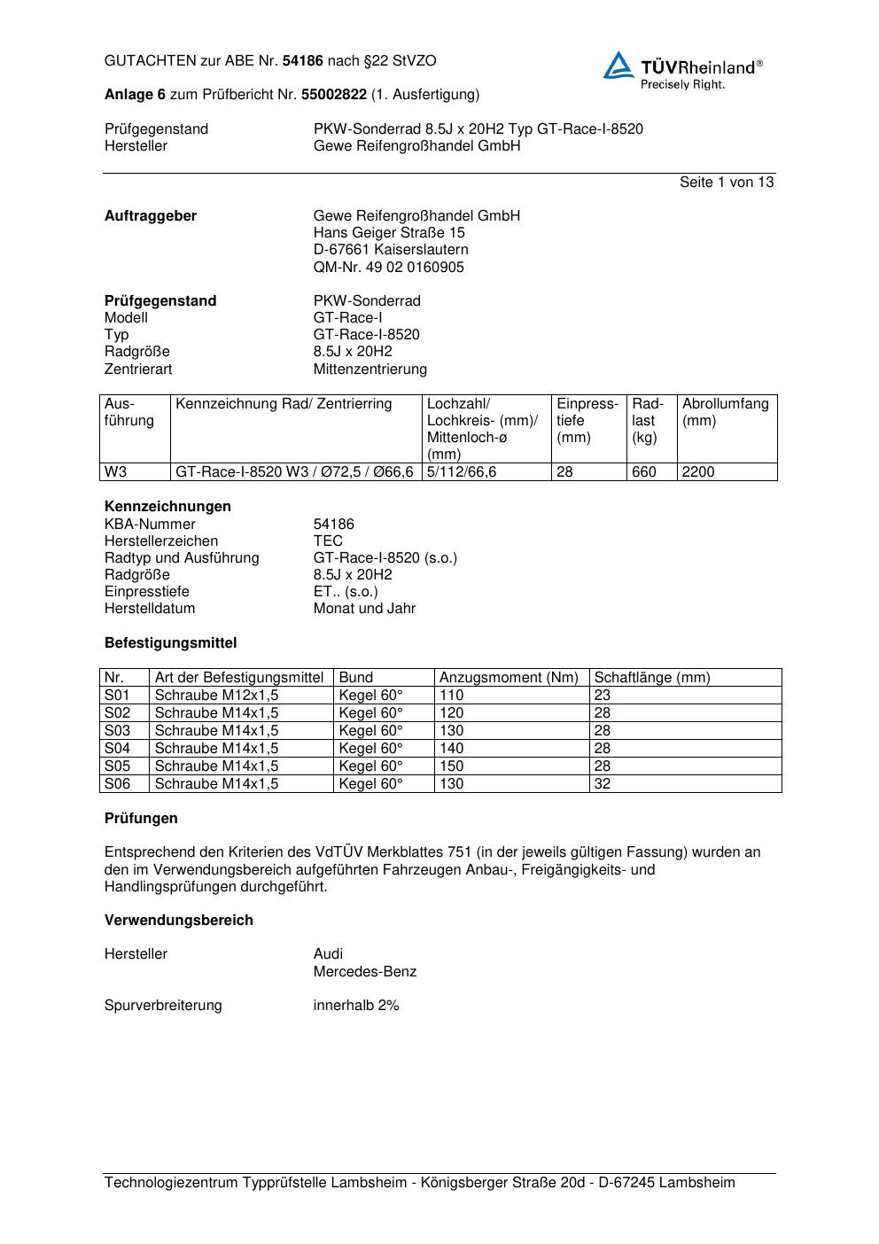 Dieses Gutachten (abe) bezieht sich auf die Alufelge GEWE GT-Rac e-I-8520 in der Ausführung ET 0, Mittenloch 0 mm (KBA 54186). Im PDF findest du typischerweise zulässige Reifengrößen, Auflagen/Anbauhinweise und – je nach Dokument – Hinweise zur Eintragung.