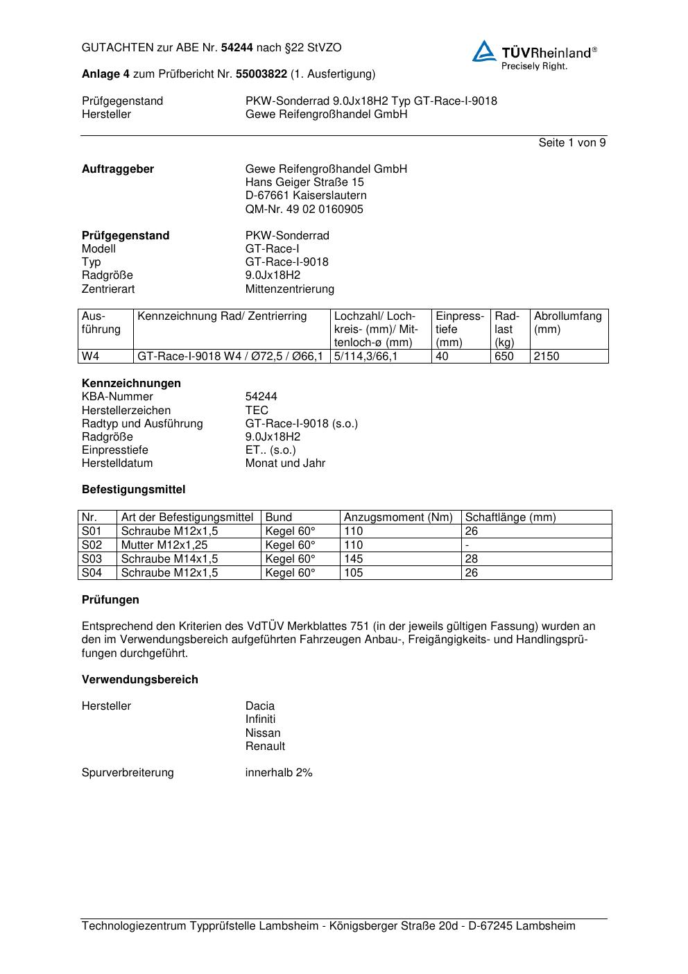 Dieses Gutachten (abe) bezieht sich auf die Alufelge GEWE GT-Race-I-9018 in der Ausführung ET 0, Mittenloch 0 mm (KBA 54244). Im PDF findest du typischerweise zulässige Reifengrößen, Auflagen/Anbauhinweise und – je nach Dokument – Hinweise zur Eintragung.