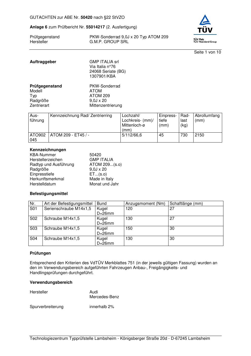 Dieses Gutachten (abe) bezieht sich auf die Alufelge G.M.P. ATOM 209 in der Ausführung ET 0, Mittenloch 0 mm (KBA 50420). Im PDF findest du typischerweise zulässige Reifengrößen, Auflagen/Anbauhinweise und – je nach Dokument – Hinweise zur Eintragung.