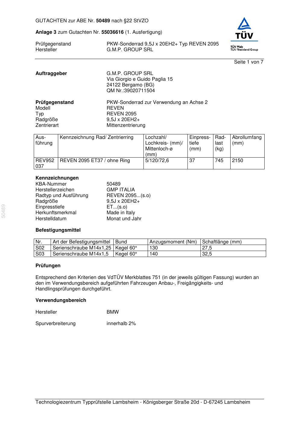Dieses Gutachten (abe) bezieht sich auf die Alufelge G.M.P. REVE N 2095 in der Ausführung ET 0, Mittenloch 0 mm (KBA 50489). Im PDF findest du typischerweise zulässige Reifengrößen, Auflagen/Anbauhinweise und – je nach Dokument – Hinweise zur Eintragung.