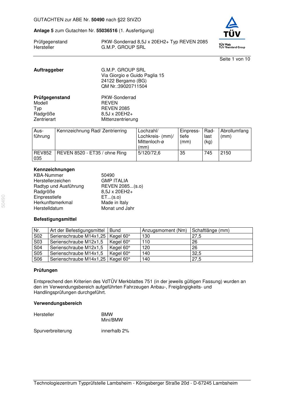 Felgengutachten / abe für Alufelgen G.M.P. REVEN 2085 (ET 0, Mittenloch 0 mm) mit KBA 50490 (Zertifikatsnummer 50490). Hier kostenlos als PDF herunterladen. Der Download-Link ist 24 Stunden gültig und kann bis zu zwei Mal verwendet werden.