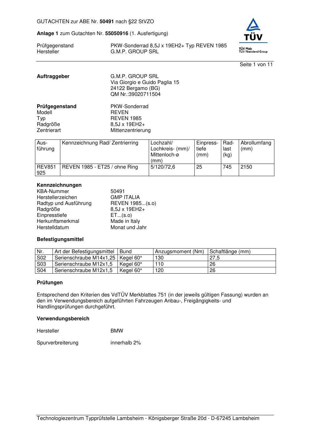 Felgengutachten / abe für Alufelgen G.M.P. REVE N 1985 (ET 0, Mittenloch 0 mm) mit KBA 50491 (Zertifikatsnummer 50491). Hier kostenlos als PDF herunterladen. Der Download-Link ist 24 Stunden gültig und kann bis zu zwei Mal verwendet werden.