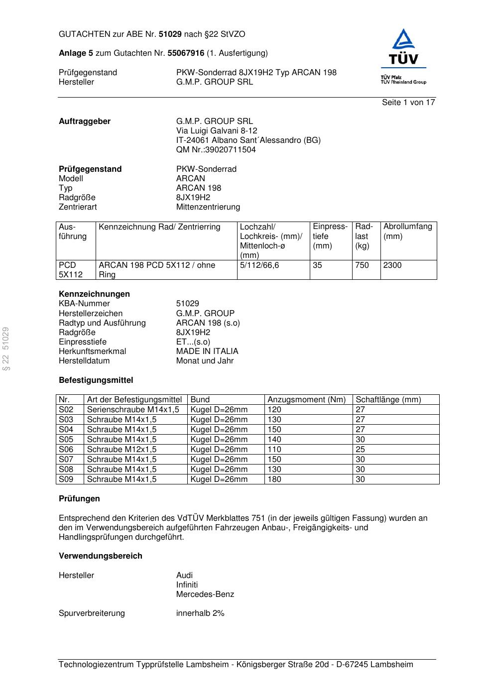 Dieses Gutachten (abe) bezieht sich auf die Alufelge G.M.P. ARCAN 198 in der Ausführung ET 0, Mittenloch 0 mm (KBA 51029). Im PDF findest du typischerweise zulässige Reifengrößen, Auflagen/Anbauhinweise und – je nach Dokument – Hinweise zur Eintragung.