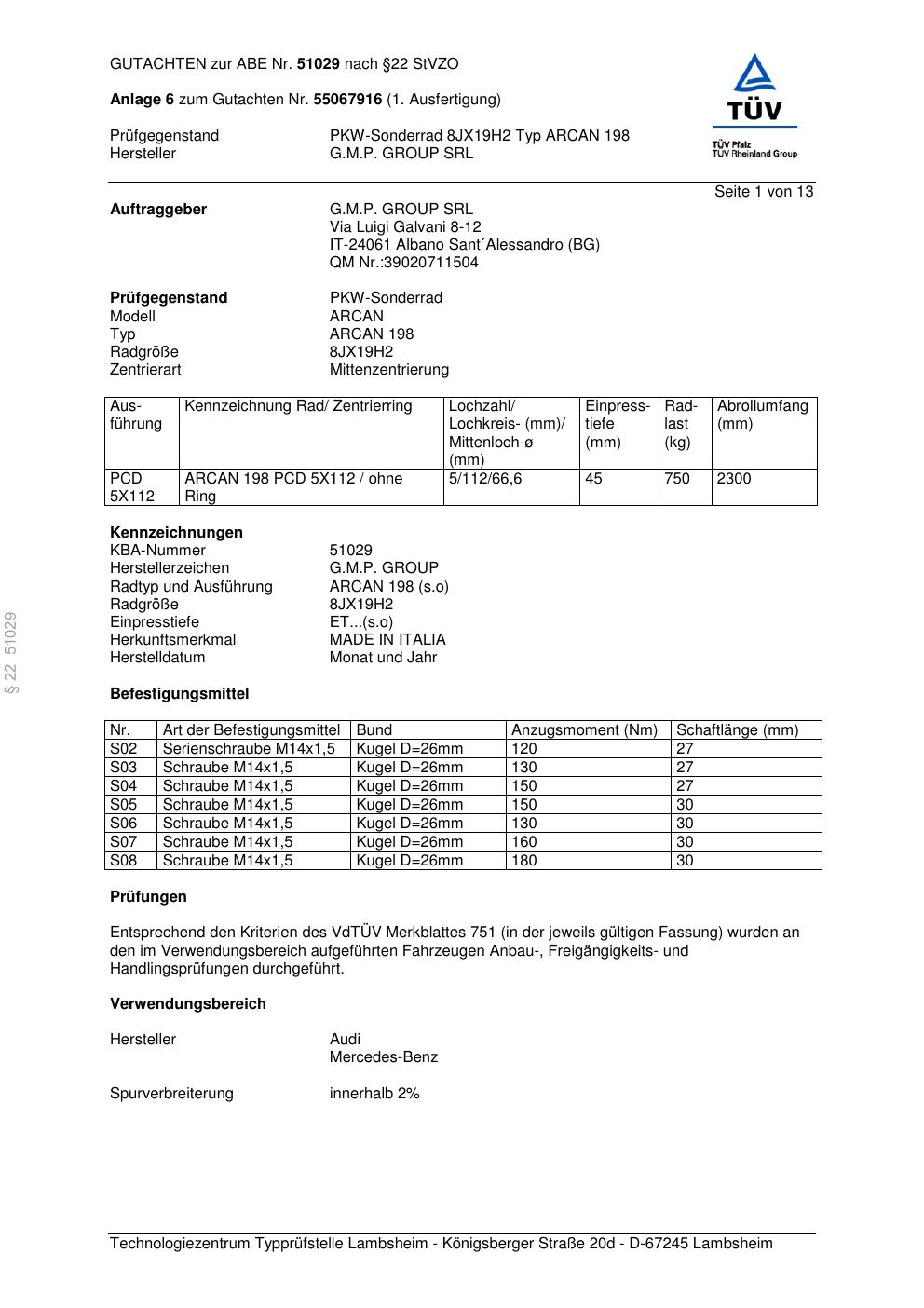Dieses Gutachten (abe) bezieht sich auf die Alufelge G.M.P. ARCAN 198 in der Ausführung ET 0, Mittenloch 0 mm (KBA 51029). Im PDF findest du typischerweise zulässige Reifengrößen, Auflagen/Anbauhinweise und – je nach Dokument – Hinweise zur Eintragung.