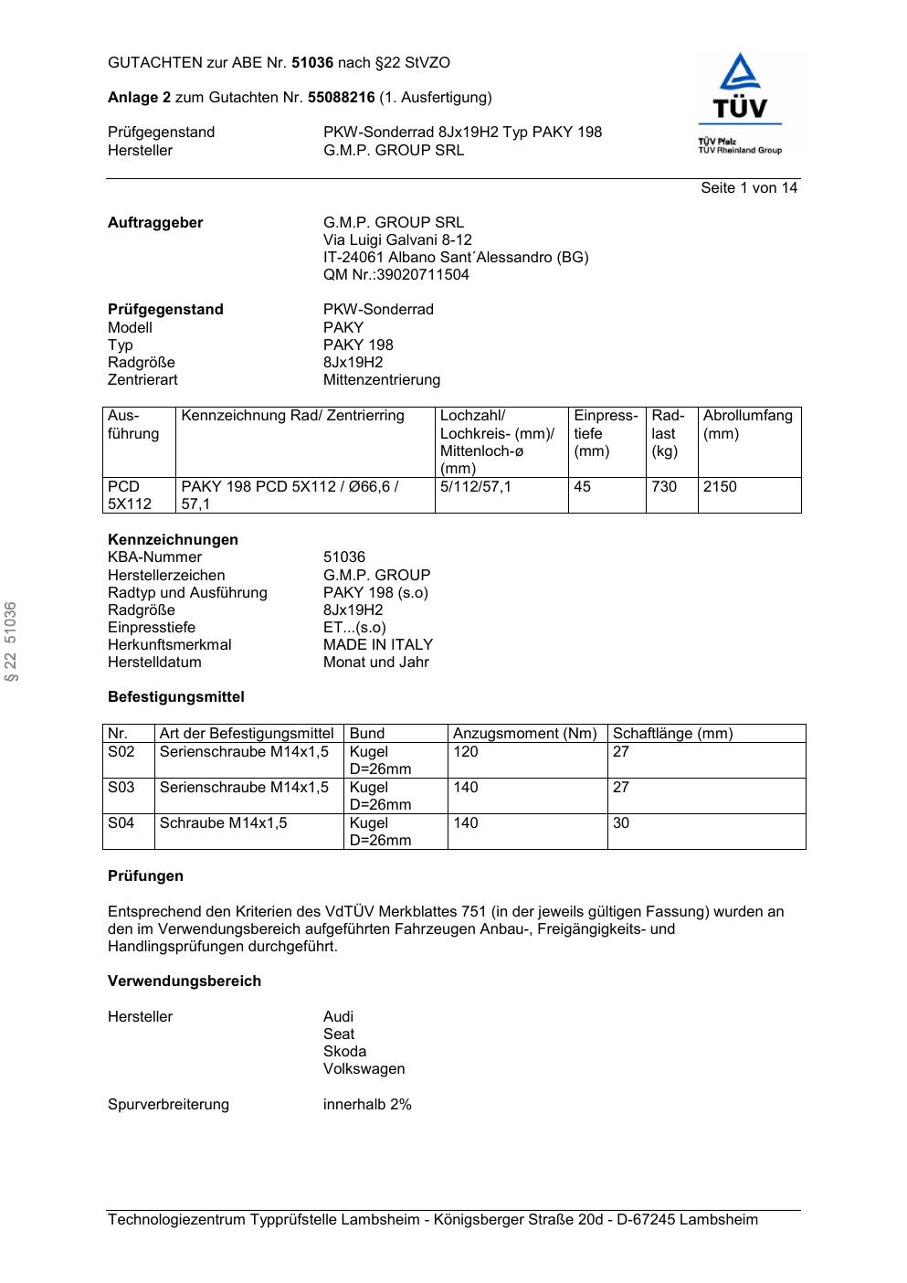 Dieses Gutachten (abe) bezieht sich auf die Alufelge G.M.P. PAKY 198 in der Ausführung ET 0, Mittenloch 0 mm (KBA 51036). Im PDF findest du typischerweise zulässige Reifengrößen, Auflagen/Anbauhinweise und – je nach Dokument – Hinweise zur Eintragung.