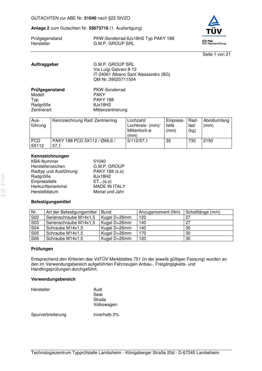 Dieses Gutachten (abe) bezieht sich auf die Alufelge G.M.P. PAKY 188 in der Ausführung ET 0, Mittenloch 0 mm (KBA 51040). Im PDF findest du typischerweise zulässige Reifengrößen, Auflagen/Anbauhinweise und – je nach Dokument – Hinweise zur Eintragung.