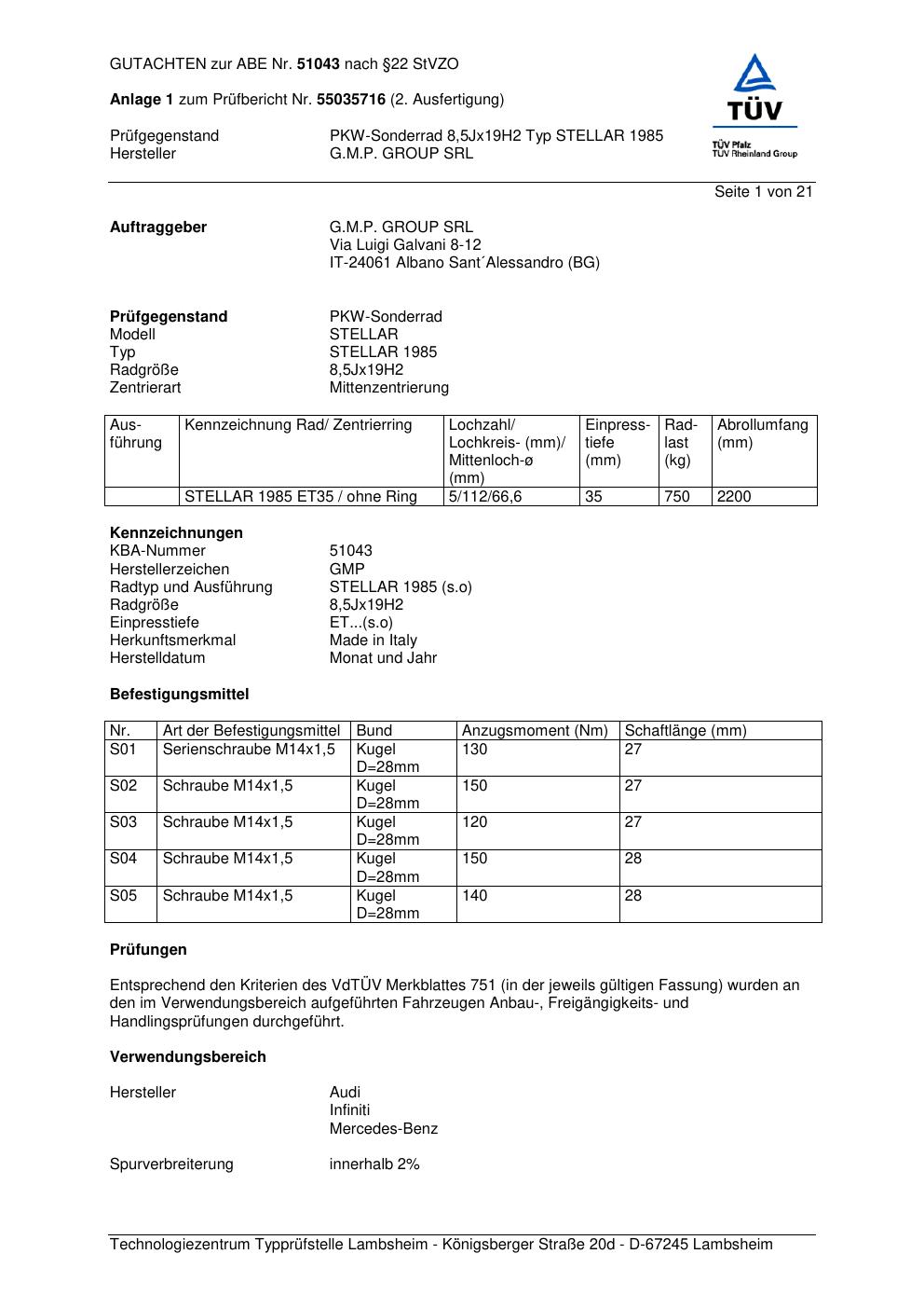 Felgengutachten / abe für Alufelgen G.M.P. STELLAR 1985 (ET 0, Mittenloch 0 mm) mit KBA 51043 (Zertifikatsnummer 51043). Hier kostenlos als PDF herunterladen. Der Download-Link ist 24 Stunden gültig und kann bis zu zwei Mal verwendet werden.