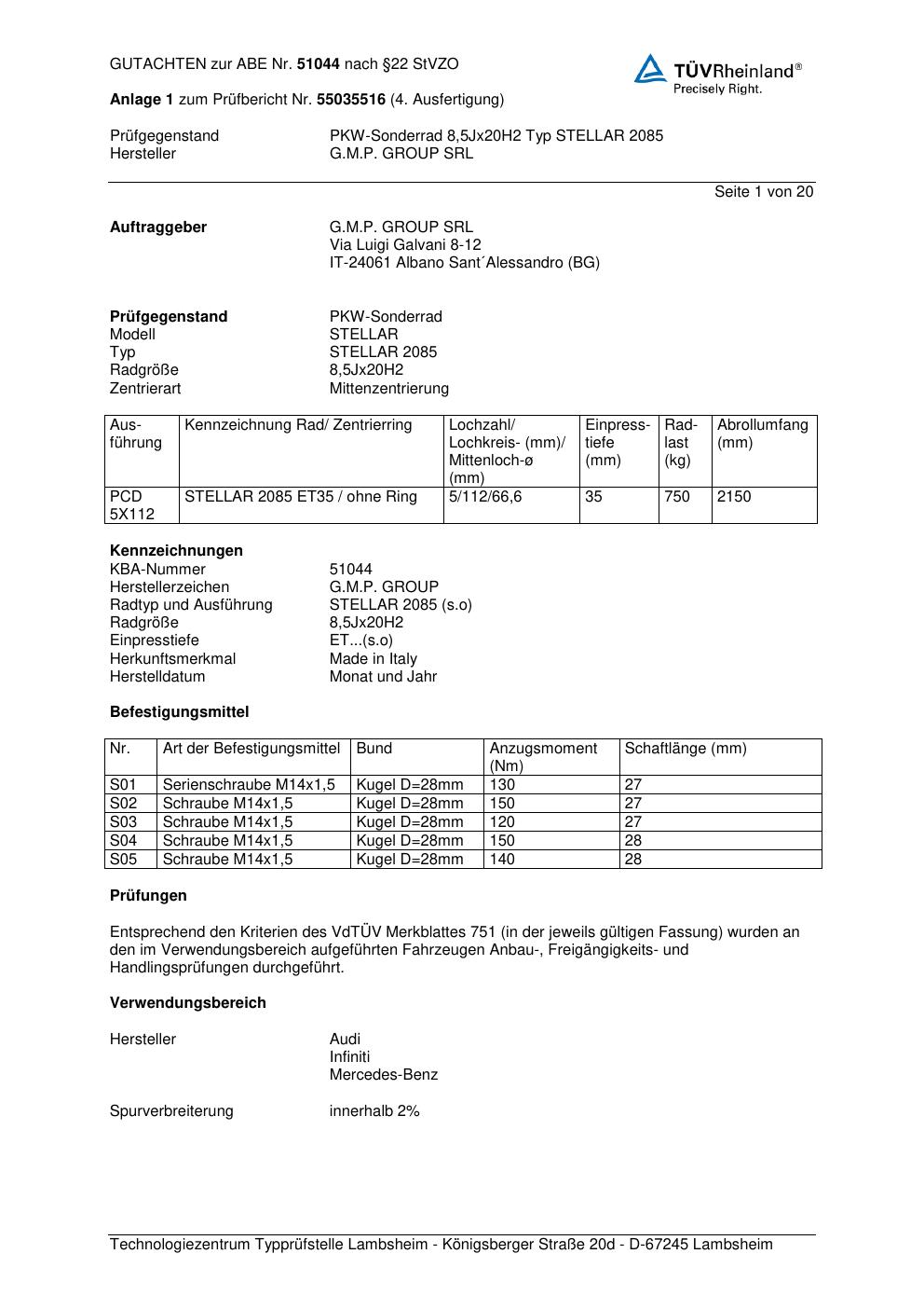 Dieses Gutachten (abe) bezieht sich auf die Alufelge G.M.P. STELLAR 2085 in der Ausführung ET 0, Mittenloch 0 mm (KBA 51044). Im PDF findest du typischerweise zulässige Reifengrößen, Auflagen/Anbauhinweise und – je nach Dokument – Hinweise zur Eintragung.